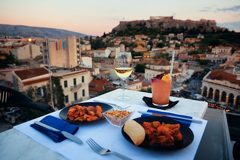 - Rooftop bars offering Acropolis views against the twilight sky